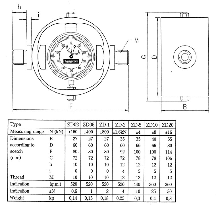 The digital indicator starts with 0.0 N or 0.000 kN. Tension will be indicated with a “+“ symbol, compression has a “–“. In case of digital product order please mark the Dynamometer name with a „dig” behind the standard type name, like ZD-2dig.