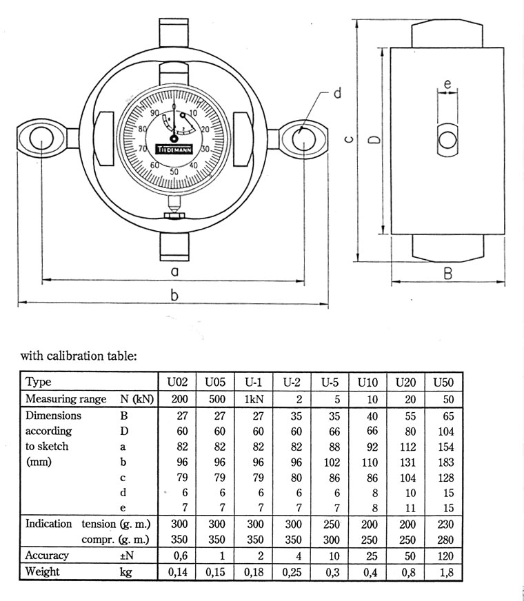 Each instrument is calibrated individually. The calibration values (10 determined values for both tension and compression) are given in a calibration table. The digital Dynamometers are marked with a “dig.” behind the type name like U10dig.