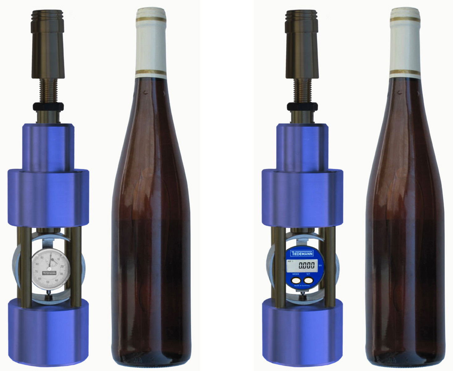 Tiedemann bietet verschiedene Prüfgeräte zur Messung der Kopfkräfte beim Verschließen von Wein- und anderen Flaschen. Die Prüfgeräte sind so geformt, dass sie als Dummy-Flaschen durch den Versiegelungsprozess laufen können. Während des Durchlaufs kann die Maximalkraft auf den Flaschenkopf gemessen werden. Alle Flaschenkopfprüfgeräte werden direkt einsatzbereit geliefert.