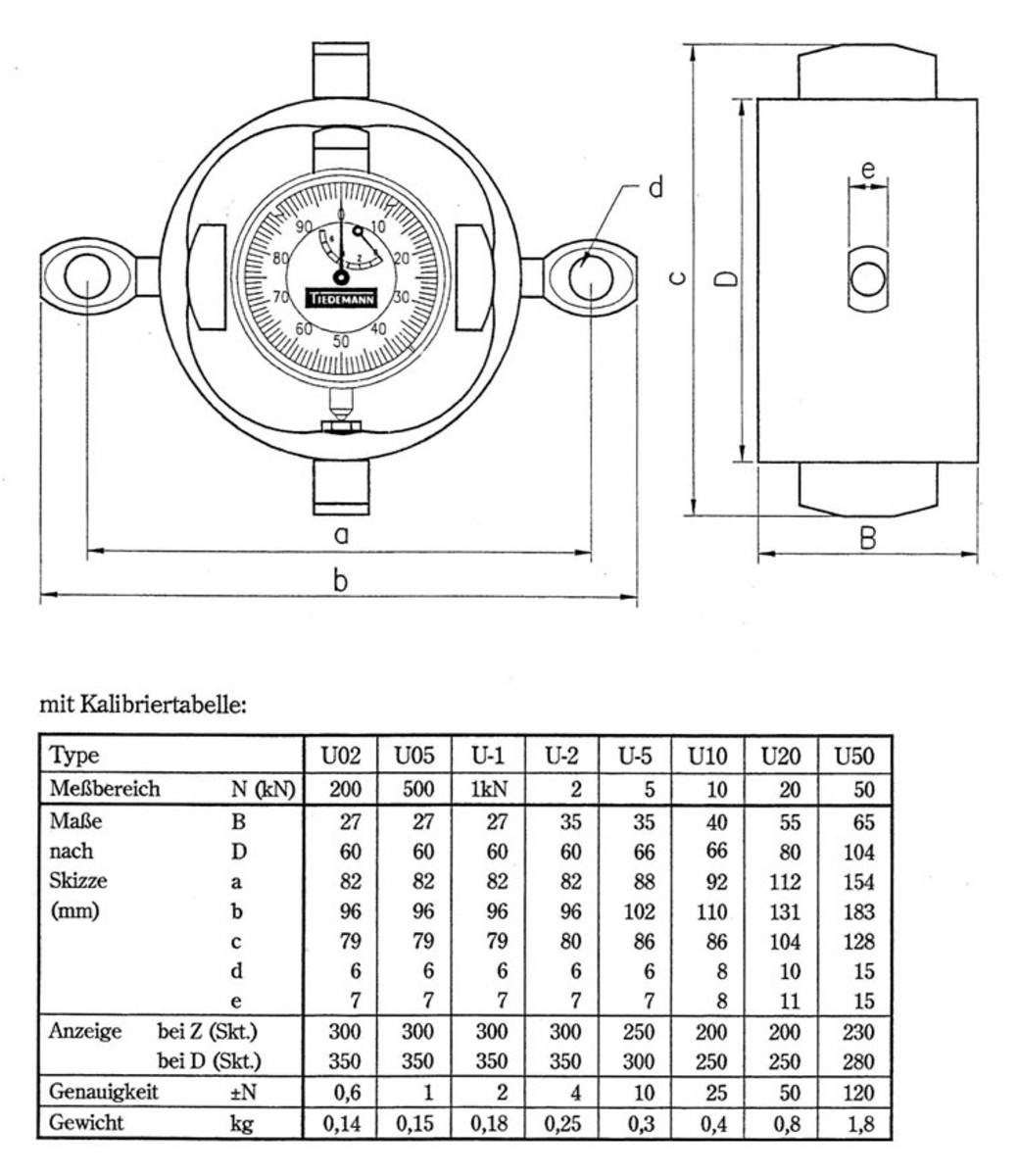 Mit diesen universellen Ringkraftmessern können – je nach Einbaulage – Zug- oder Druckkräfte gemessen werden. Jedes Gerät wird individuell kalibriert. Die Kalibrierwerte mit jeweils 10 ermittelten Werten für Zug und Druck werden in Tabellenform mitgeliefert.