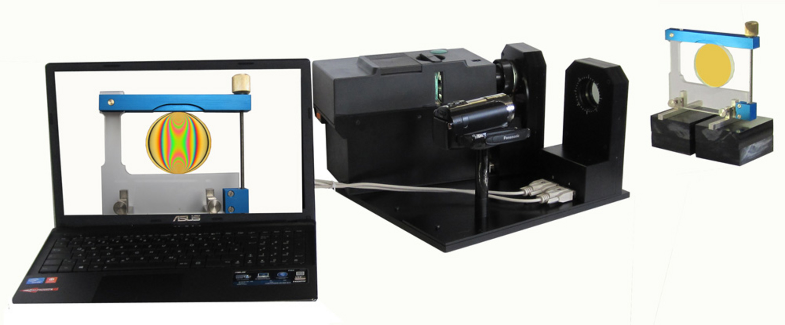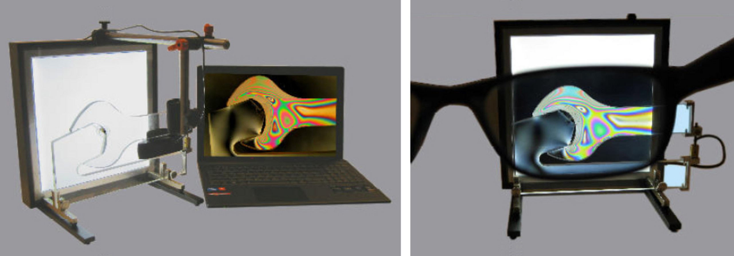Zum einen das LED-Polariskop für Beamer-Präsentation. Es besteht aus einem flachen Lichtkasten für weißes Licht für zirkulare Spannungsoptik und einer Kamera mit Halterung zur Übertragung des Bilder auf einen Computer. Das Polariskop kann vertikal oder horizontal verwendet werden und ist wie alle Polariskope passend für alle unsere Modelle. Der Vortragende blickt zur Erklärung auf seinen Monitor oder verwendet unsere spannungsoptische Brille mit zirkularen Polarisationsfiltern.