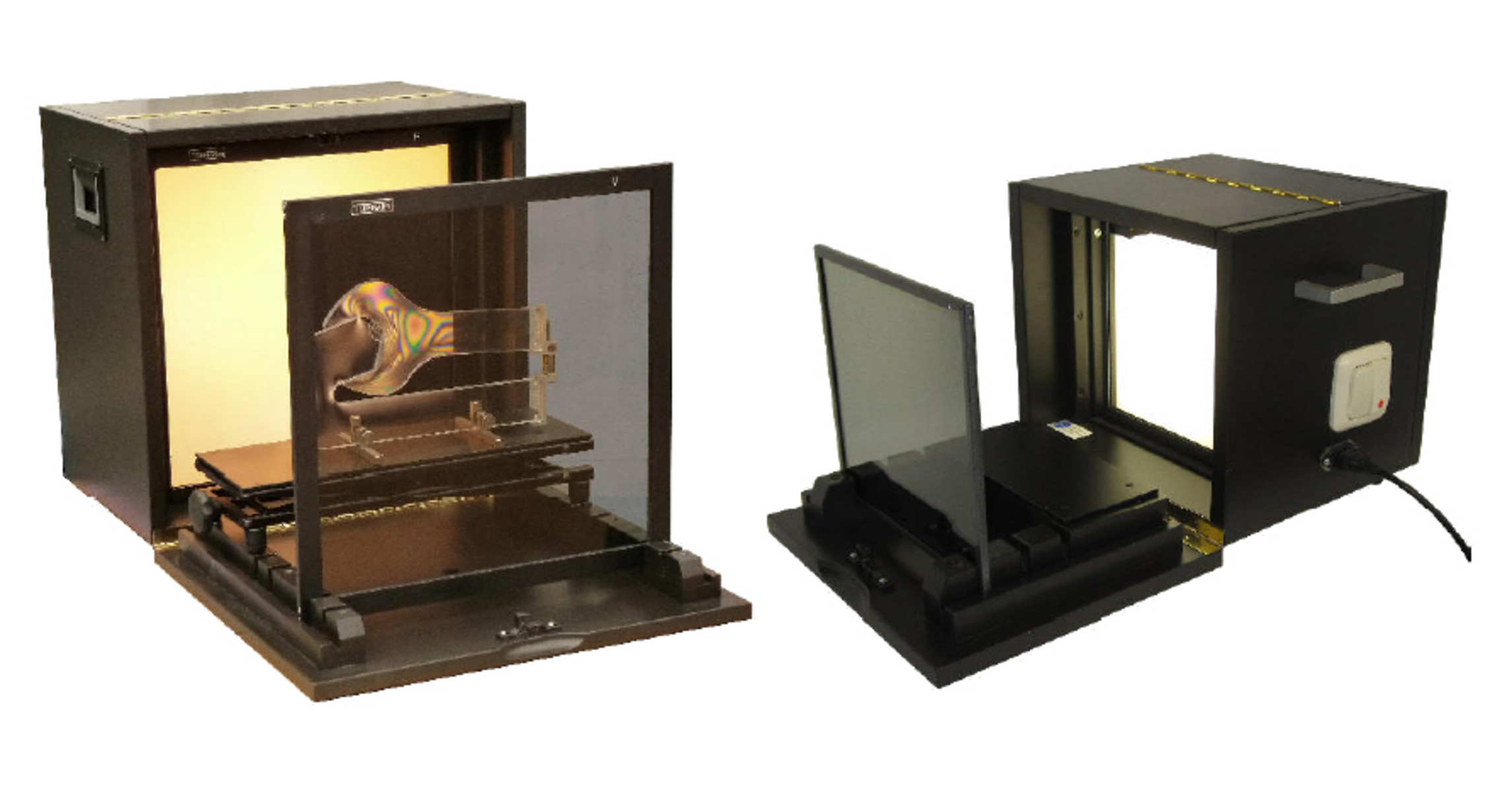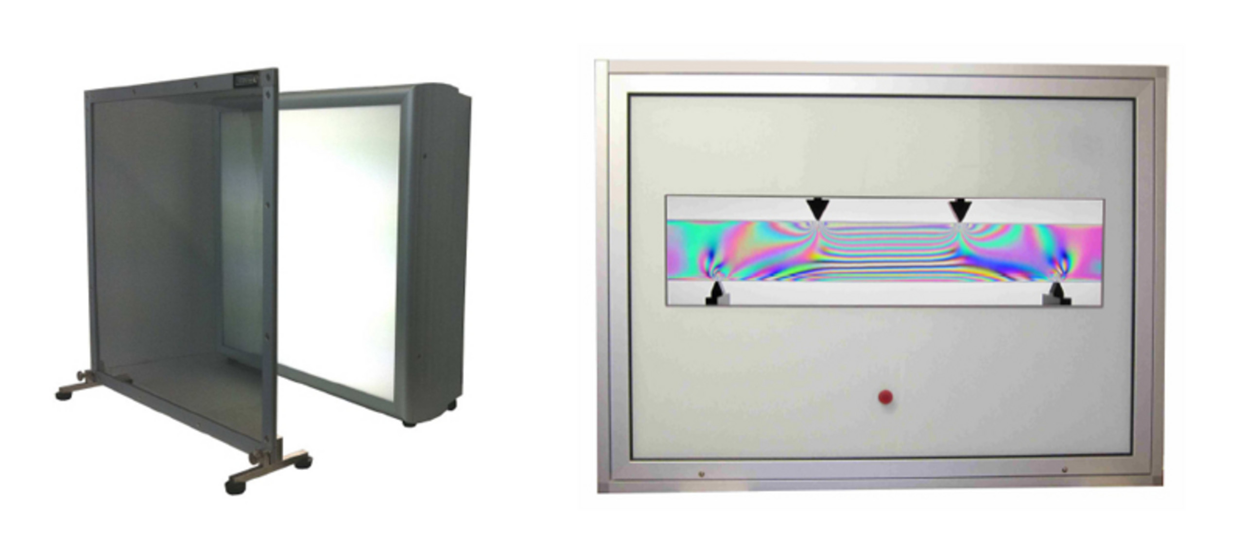 Koffer-Polariskope sind Diffuslicht-Polariskope für lineare und zirkulare semiquantitative Spannungsoptik. Wegen ihrer vielseitigen Einsatzmöglichkeiten, ihrer bequemen Handhabung und des günstigen Preises werden sie sehr häufig benutzt.
