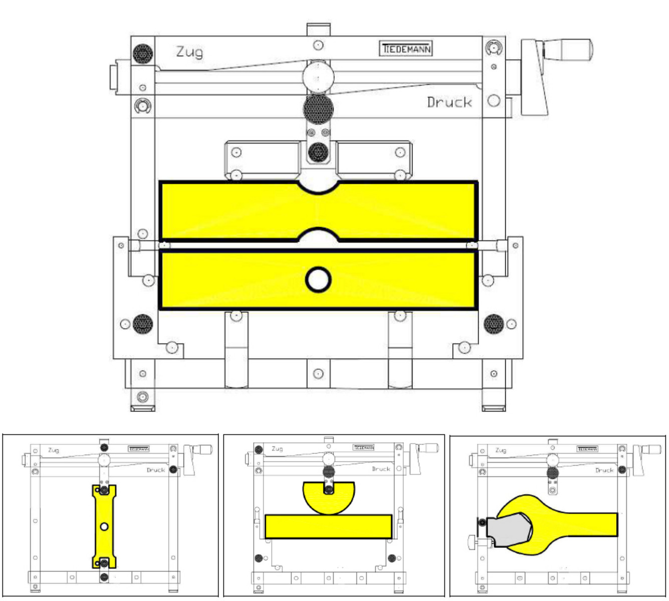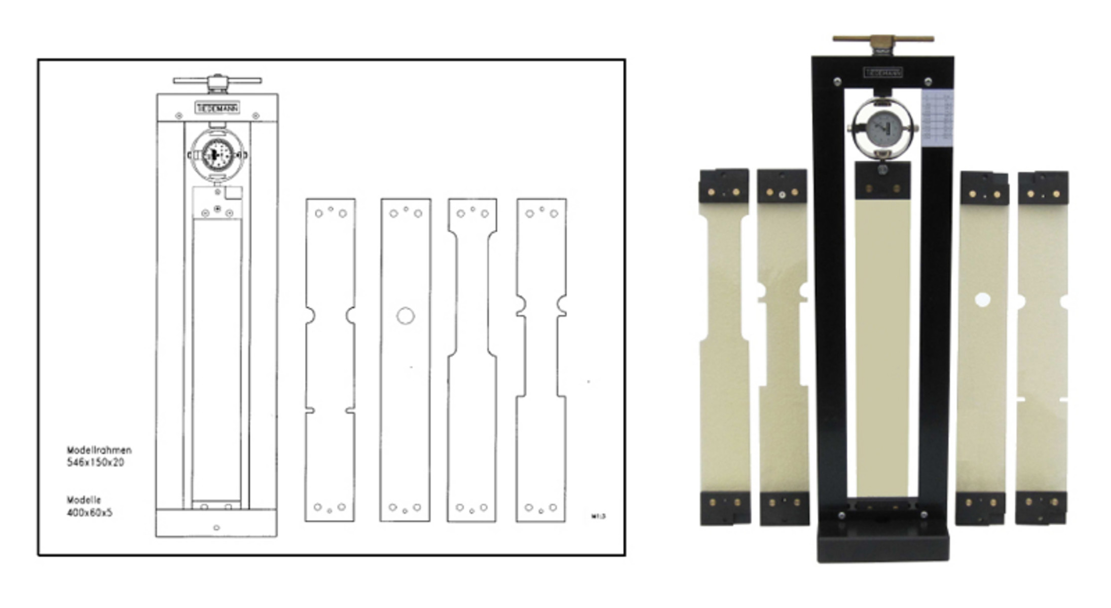 Die Manufaktur Tiedemann bietet einen universellen Belastungsrahmen, mit dem Spannungen in Bauteilen ideal demonstriert werden können. Als Belastungen werden Zug-, Druck- oder Biegekräfte aufgebracht.