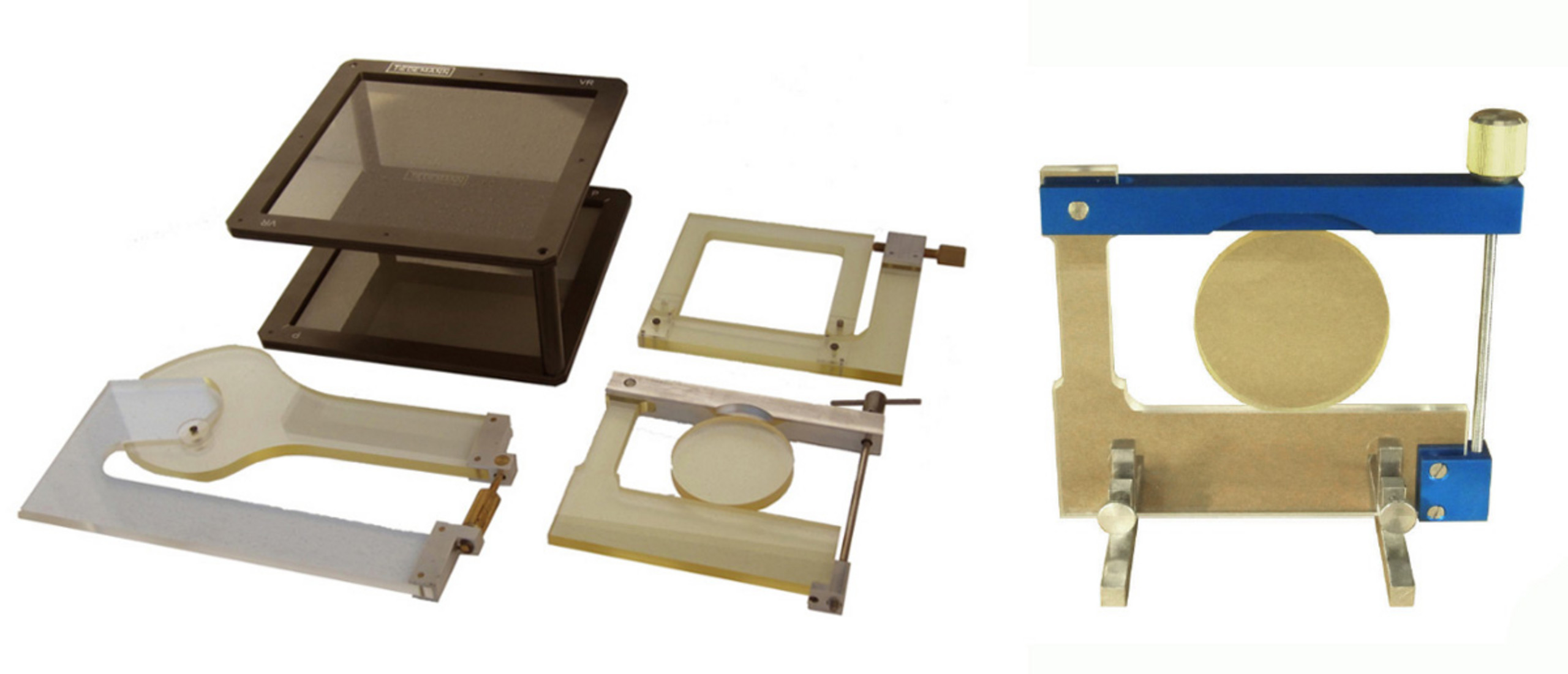Die bisher von uns gefertigten Polariskope des Typs Spezial reichen von Gesichtsfeldern von 48 x 48 cm bis zu 191 x 126 cm. Sie können stehend oder auch hängend eingesetzt werden. Sie bestehen aus einem Lichtkasten mit weißer Beleuchtung, einer Milchglasscheibe und der zirkularen Polarisationsfolie. Der Analysator ist in einem Rahmen gleicher Größe gespannt. Alternativ können zum großen Analysator auch tragbare Analysatoren in dem Maß 48 x 48 cm oder noch praktischer unser spannungsoptische Brille mit zirkularer Polarisationsfolie eingesetzt werden.